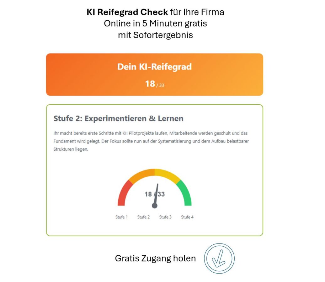 Wer möchte, kann das Ergebnis anschließend in einem kostenlosen 15-Minuten-Zoom-Gespräch mit einem KI-Experten besprechen – praxisnah, individuell und völlig unverbindlich.