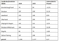 Die stärksten Zuwächse verzeichneten die Landeshauptstadt Potsdam (+21,3 Prozent) sowie die Landkreise Potsdam-Mittelmark (+12,3 Prozent) und Teltow-Fläming (+11,8 Prozent). Rückgänge gab es insbesondere in der kreisfreien Stadt Brandenburg an der Havel (-13,5 Prozent), Oberhavel (-5,9 Prozent) und Prignitz (-3,7 Prozent).