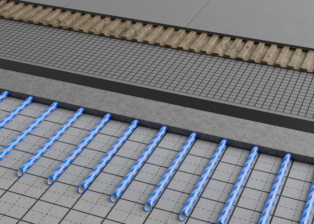 Während BLANKE SF BASE für sicheren Halt sorgt, gewährleistet das PE-RT-5-Schicht-Rohr mit Sauerstoffsperrschicht dauerhafte Funktion. BLANKE FILLOCREED verteilt die Wärme gleichmäßig und erlaubt Schichtdicken bis 25 mm. Nicht zuletzt übernimmt die BLANKE DISK Abdichten und Entkoppeln in einem Arbeitsschritt. Das Ergebnis ist ein dünnschichtiger, effizient beheiz- oder kühlbarer sowie normgerecht abgedichteter Bodenaufbau für Fliesen- und Natursteinbeläge.