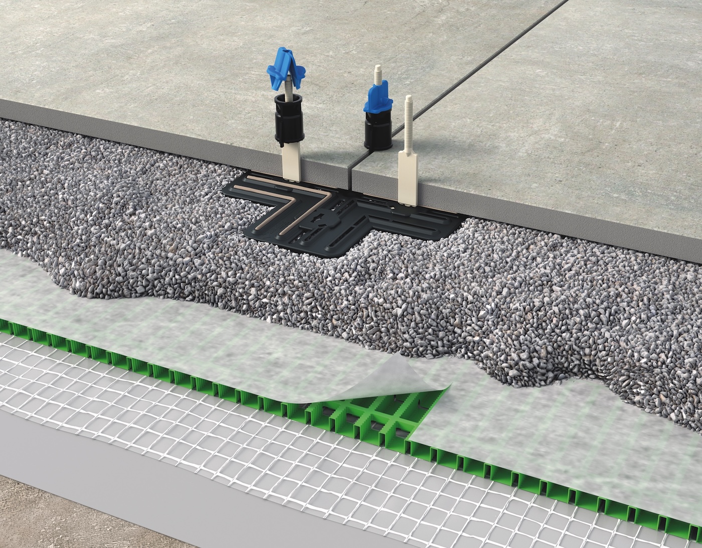Gerade leichtgewichtige Keramikelemente neigen bei Verlegung im Kies- oder Splittbett zum Kippeln und Wandern. AquaDrain FS stabilisiert solche Konstruktionen mechanisch: Der Belag wird im Fugenkreuz mit dem Montagekleber DiProtec FIX-MSP auf der Fixierplatte befestigt und mit dem Nivelliersystem IndorTec FN-XT exakt ausgerichtet.\“Die Fixierplatte verbindet die Platten im Fugenkreuz miteinander und verkrallt sich im Untergrund. Das sorgt dafür, dass die Platten fest liegen – horizontal und vertikal\“, sagt Gutjahr-Produktmanager Thomas Römer.\“So entsteht eine deutlich ruhigere Fläche – auch bei intensiver Nutzung, und auch 2 cm dünne Keramikplatten können sicher lose verlegt werden\“, erklärt Römer. Ein weiterer Vorteil: Durch die Stabilisierung sind auch geschlossene Fugen mit dem Spezial-Fugenfüllstoff MorTec SOFT möglich.