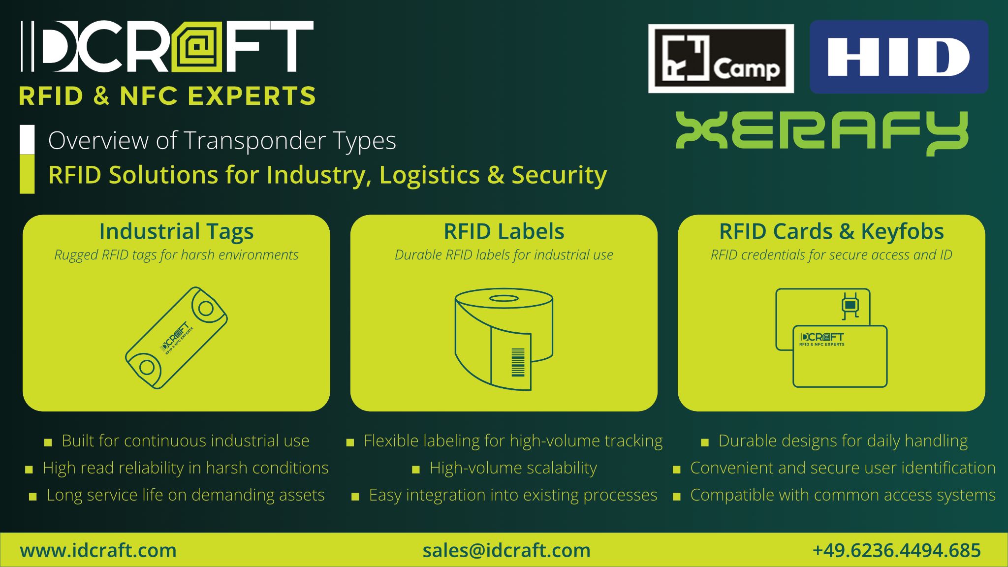 Als erfahrener Distributor bietet die IDCRAFT GmbH ein herstellerunabhängiges RFID-Transponder-Portfolio für unterschiedlichste Anforderungen. Das Sortiment umfasst RFID-Tags und Labels von renommierten Herstellern wie HID, Xerafy und RFCamp. Kunden profitieren von einer großen Auswahl an Technologien, Bauformen und Materialien, abgestimmt auf konkrete Anwendungen und Einsatzumgebungen.