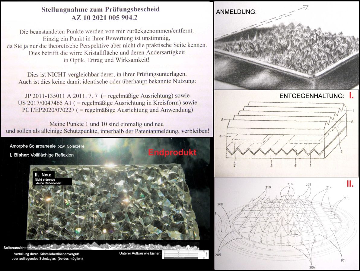 \“Ihre Patentanmeldung mit dem Aktenzeichen 10 2021 005 904.2 mit der Bezeichnung‚Solarmodul bzw. Solarpaneel mit größtmöglicher Oberfläche befindet sich noch im Patentprüfungsverfahren. Das Patent wurde bisher nicht erteilt. Status: Anhängig/in Kraft.\“