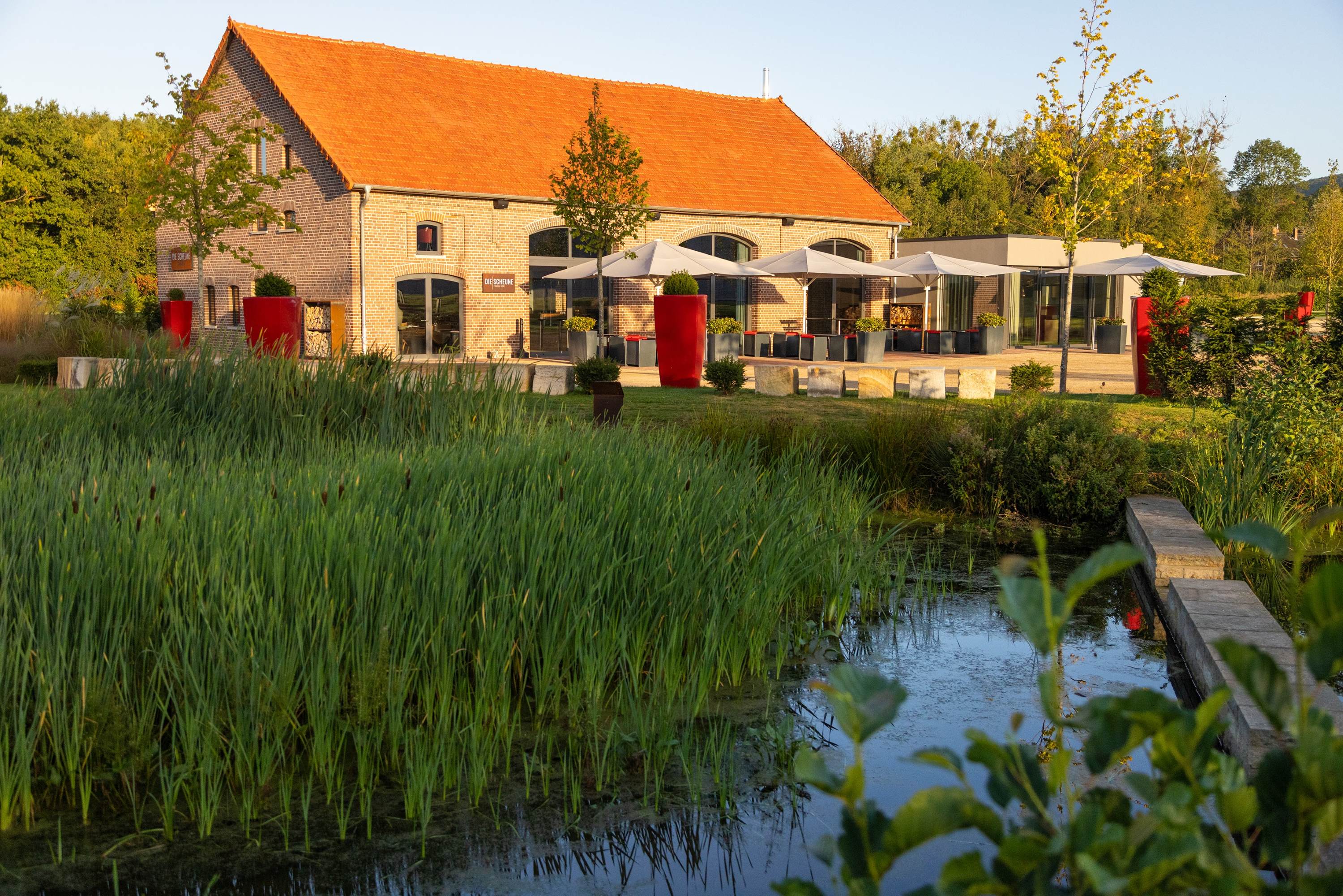 Ein weiterer Pluspunkt ist die Umgebung: DIE SCHEUNE liegt mitten im DENIOS4ELEMENTS-Park, einem Wissens- und Naherholungspark auf dem Gelände von DENIOS. Die großzügige Terrasse direkt vor dem Gebäude lädt zu Empfängen, Grillabenden oder entspannten Pausen im Freien ein.