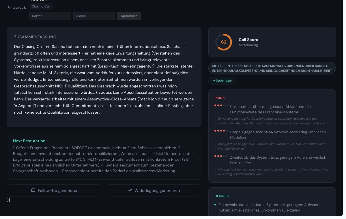 PainFinder wurde entwickelt, um diese Lücke zwischen Vertrieb und Marketing zu schließen. Die Plattform analysiert Sales-Calls, Chat-Verläufe und E-Mails mithilfe künstlicher Intelligenz und extrahiert automatisch Pains, Einwände, Vorwände und Kauftrigger. Aus den gewonnenen Erkenntnissen generiert das System verwendbare Marketing-Assets wie Ad-Hooks, E-Mail-Sequenzen und Vertriebsskripte in der authentischen Sprache der Zielgruppe.