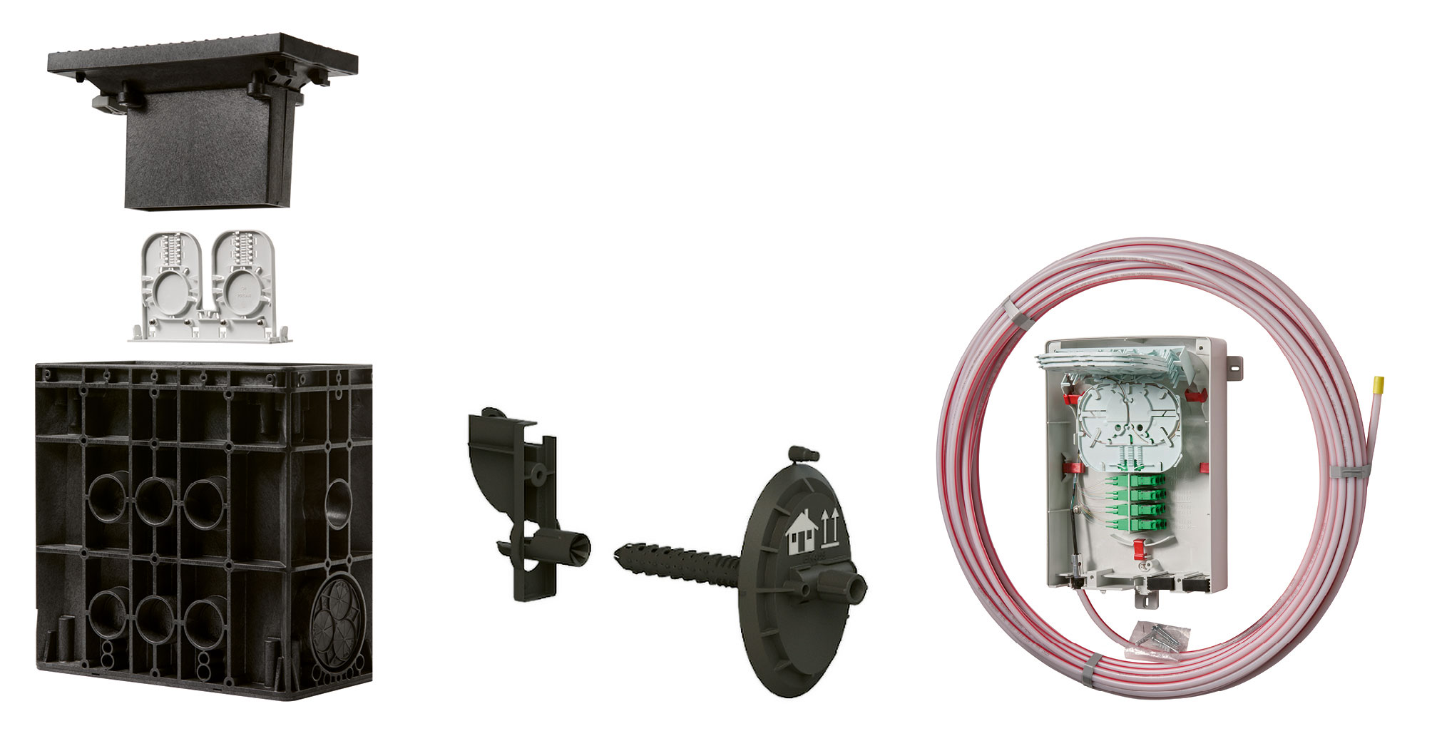 – Glasfaser-Abschlusspunkte, Größe M oder L: vorkonfektioniert, übersichtlich und leicht zu montieren. Sie reduzieren die Installationszeit deutlich und sorgen für eine zuverlässige Netzabschlusslösung.