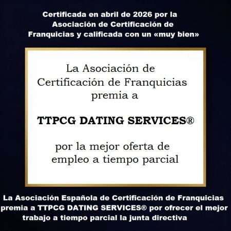 Von der Asociacion Espaoola de Certificacion de Franquicias wurde TTPCG DATING SERVICES® im April 2026 dafür geehrt und ausgezeichnet, dass dieser internationale Franchisegeber ein seit Jahrzehnten bewährtes Franchisesystem bietet für Menschen, die ihren Hauptberuf nicht verlassen wollen oder können. TTPCG® bietet eine lukrative Möglichkeit zum Einstieg mit einemNebenjob, ohne Risiko in der Sicherheit eines globalen Netzwerks eines starken, renommierten Franchisegebers loszulegen.