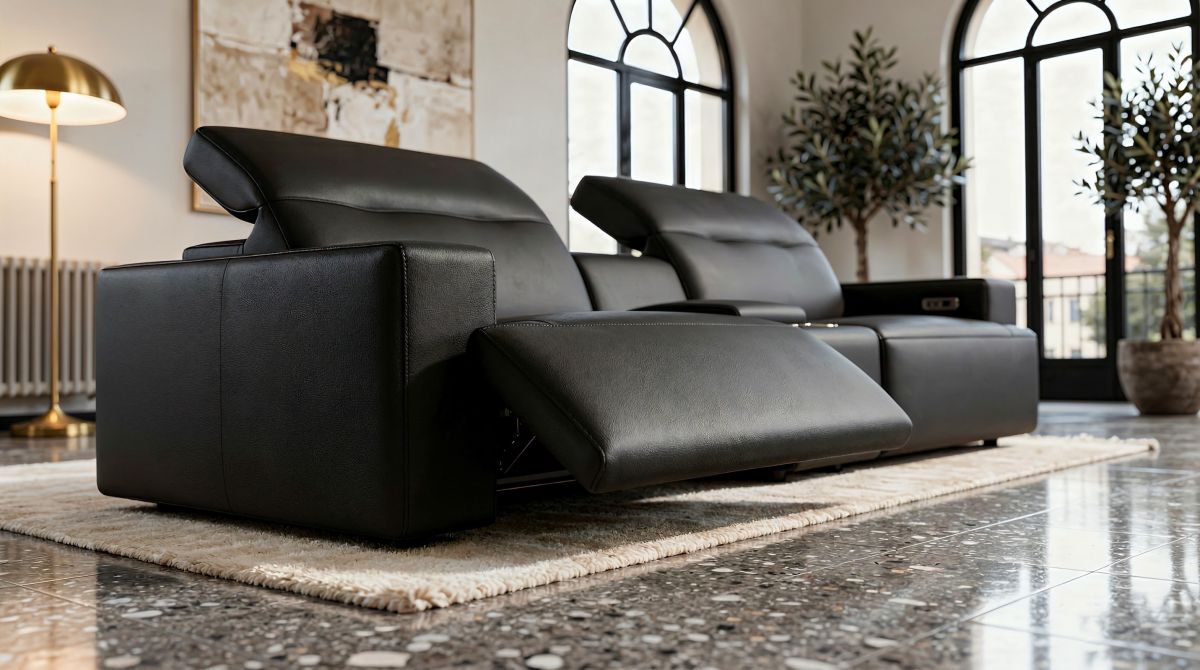 3-Sitzer Familien-Kinosofa: Drei elektrisch verstellbare Plätze mit zwei Mittelkonsolen und vier Getränkehaltern. Ideal für Familien mit Kindern oder größere Gruppen.