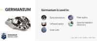 Germanium ist ein hartes, gräuliches und sprödes Halbmetall. Germanium findet zunehmend Anwendung in der Elektronik und Solarindustrie, in der Faseroptik sowie in der Infrarotoptik für zivile und militärische Zwecke. Germanium ist auf der Liste der kritischen Metalle Kanadas, der Vereinigten Staaten und der Europäischen Union aufgeführt.