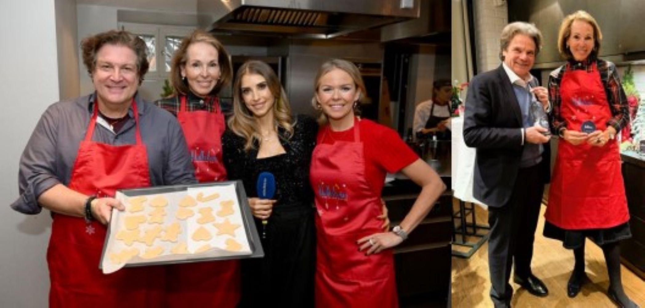 \“Atelier\“von Feinkost Käfer passend zum gesunden Wasser, Tipps wie man köstliche Plätzchenohne bzw. wenig Zucker und ungebleichtem Mehl backt. Cathy Hummels kam als TV-Reporterin für München TV und unter den Gästen waren die Moderatorinnen Alexandra Polzin und Carolin Henseler, Influencer Julia Haupt, Schauspieler Frances Fulton-Smith, die Künstlerin Alexandra Kordes und Nathalie Braun Barends, die Galeristinnen Sarah Kronsbein und Rebecca Niehues-Paas, die Modedesignerin Kinga Mathe, Hermine Prinzessin zu Salm, Katrin Gräfin GoessEnzenberg, Unternehmensberaterin Nathalie Ziegler und viele weitere Powerfrauen spendeten, tauschten emsig Rezepte und backten fleißig ein Blech Plätzchen nach dem anderen- alles für den guten Zweck. Die Geld- und Back-Spenden im Rahmen des Charity-Backens kommen zu 100 % der\“Clarissa&Michael Käfer Stiftung\“zugute, die sich vor allem um sozial benachteiligte Senioren kümmert. Die profitieren auch von den vielen gebacken Plätzchen, die ihnen die Adventszeit etwas versüßen sollen.