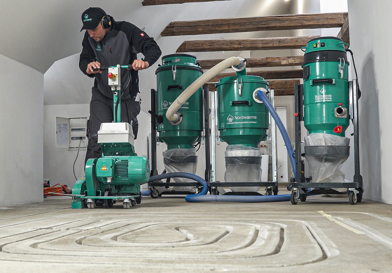 3. Fußbodenheizung einfräsen: Diese Maßnahme ist unabhängig von der künftigen Heizquelle wirtschaftlich sinnvoll. Eine Fußbodenheizung senkt den Energiebedarf gegenüber Heizkörpern um 10 bis 20 % – völlig egal, ob das eine Gas-/Ölheizung oder Wärmepumpe wird. Mit der innovativen Fräsmethode von Nordwaerme lässt sich eine Fußbodenheizung im Bestand oft innerhalb weniger Tage nachrüsten – bei Kosten von meist nur rund 5.000 Euro pro Etage.