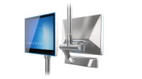 Ebenso modular ist das Zubehör- und Erweiterungskonzept: Über eine robuste Bajonettverbindung lassen sich spezifisch auf Hygieneaspekte und gründliche Reinigung ausgelegte Zubehörteile anbringen. Dazu zählen ein Zusatztastenmodul für Hardwaretaster für die Integration bspw. eines Not-Aus, eine Tastaturablage, ein Scanner-Halter oder ein extern verschraubter USB-Steckplatz lassen sich werkzeuglos anbringen.