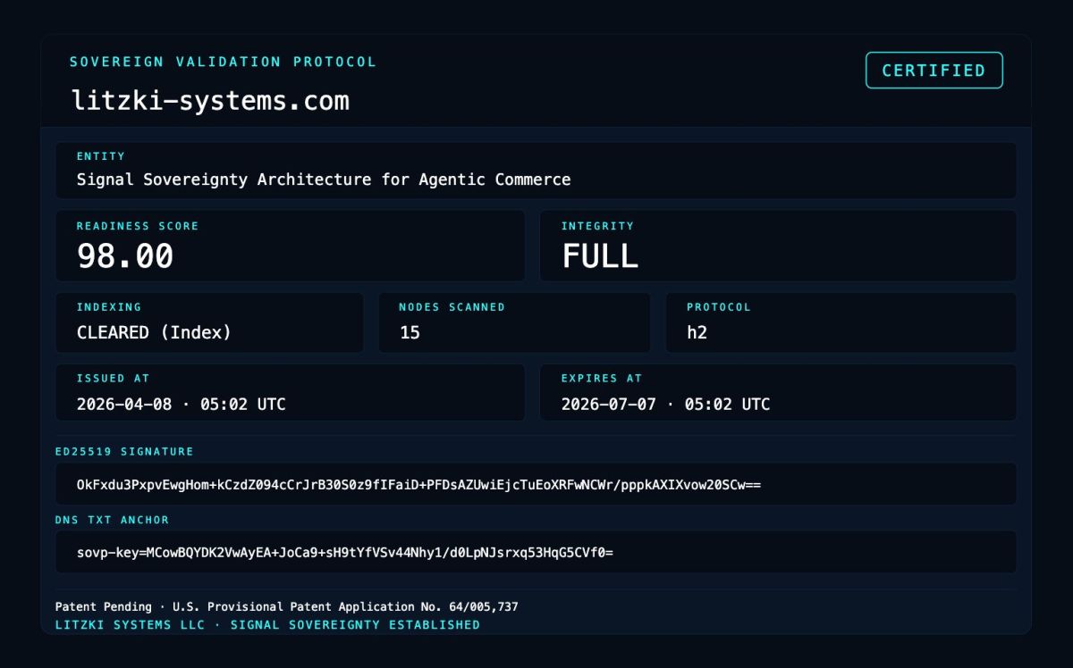 Für Entscheider mit Handlungsbedarf bietet Litzki Systems die Founding-Client-Promo: 230+ Parameter-Audit, Ed25519-signiertes Zertifikat, permanente Listung im SOVP-Protokoll als Trust Node und 1-Stunden-Direktkonsultation mit Gründer Thorsten Litzki. Preis: €890. Lieferung: 14 Werktage. Garantie: Null Findings = volle Rückerstattung. Bisher wurde kein Refund ausgegeben. Der Validator findet immer etwas. Nur 5 Plätze verfügbar unterhttps://litzki-systems.com/de/founding-client-programm.