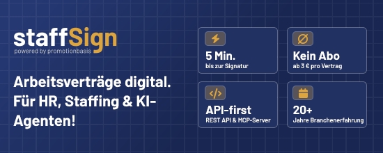 Gleichzeitig richtet sich staffSign auch an Unternehmen mit bestehenden Systemen und automatisierten Prozessen:Über eine moderne Schnittstelle (API) lässt sich die Plattform einfach anbinden. So können Verträge direkt aus bestehenden HR- oder Recruiting-Systemen heraus erstellt und verwaltet werden.