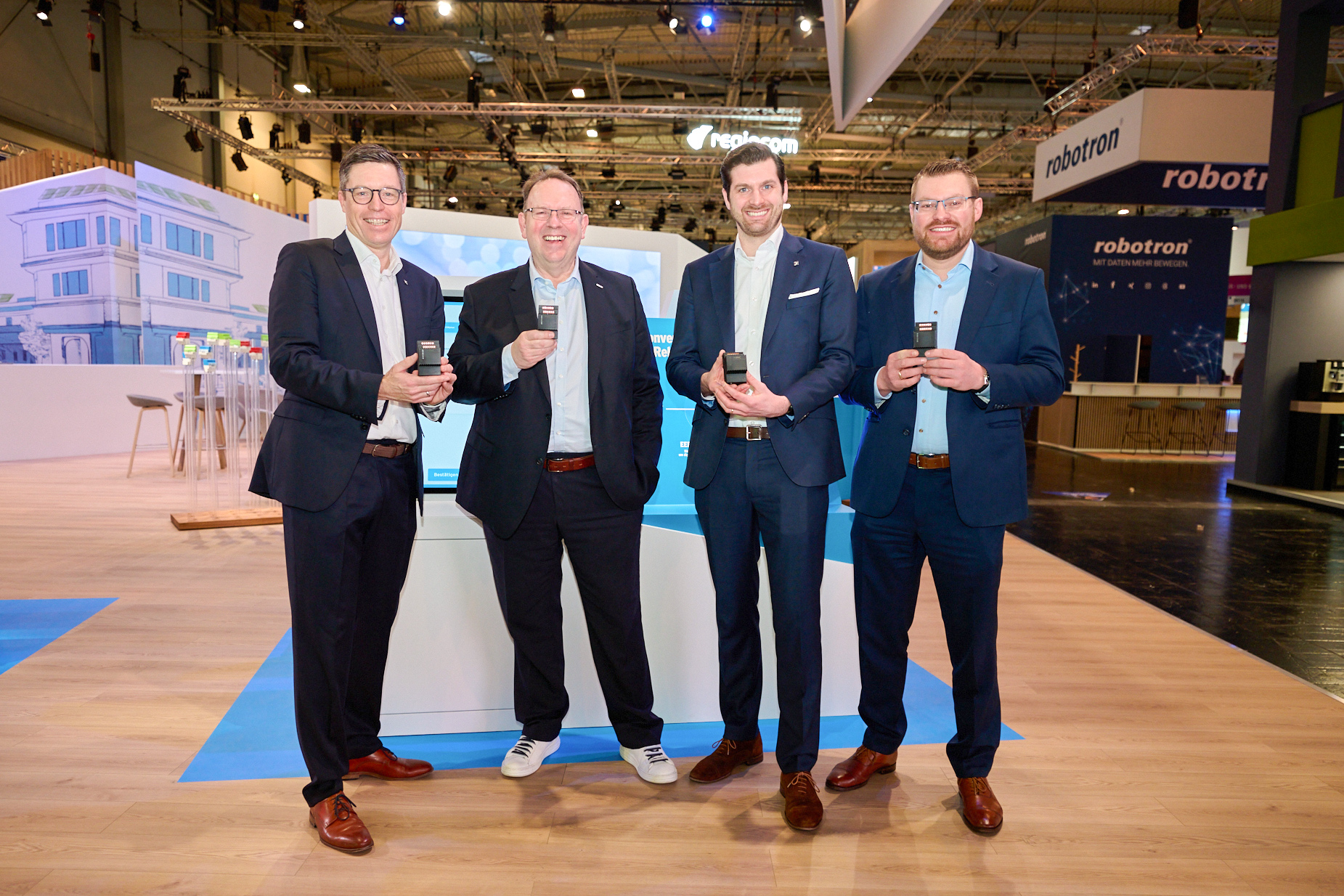Präsentieren den neuen EEBUS Relais Converter auf der E-world: (v. l. n. r.) Dr. Timo Berger, Chief Technology Officer bei Weidmüller, Ingo Schönberg, Vorstandsvorsitzender von PPC, Dr. Christian von Toll, Chief Sales Officer bei Weidmüller, und Janosch Wagner, Chief Technical Officer beiPPC (Bild: Power Plus Communications).