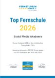 Der Award„TOP-Fernschule“ von FernstudiumCheck basiert ausschließlich auf authentischen Bewertungen von Absolventinnen und Absolventen. Bewertet werden unter anderem Lehrinhalte, Betreuung, Studienmaterialien und Praxisrelevanz. Nur Anbieter mit überdurchschnittlich positiven Rückmeldungenund einer besonders hohen Weiterempfehlungsquote erhalten diese Auszeichnung. Die Social Media Akademie erfüllt diese Kriterien auch 2026 erneut und positioniert sich damit dauerhaft unter den beliebtesten Fernschulen im deutschsprachigen Raum.