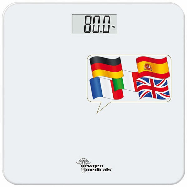 Klar verständliche Sprachausgabe in fünf Sprachen: DiePersonenwaagevonnewgen medicalsgibt das gemessene Gewicht gut hörbar auf Deutsch, Englisch, Französisch, Italienisch und Spanisch aus – ein Bücken oder Ablesen entfällt damit. Die Sprachausgabe ist besonders hilfreich, wenn das Display nicht immer klar erkennbar ist.