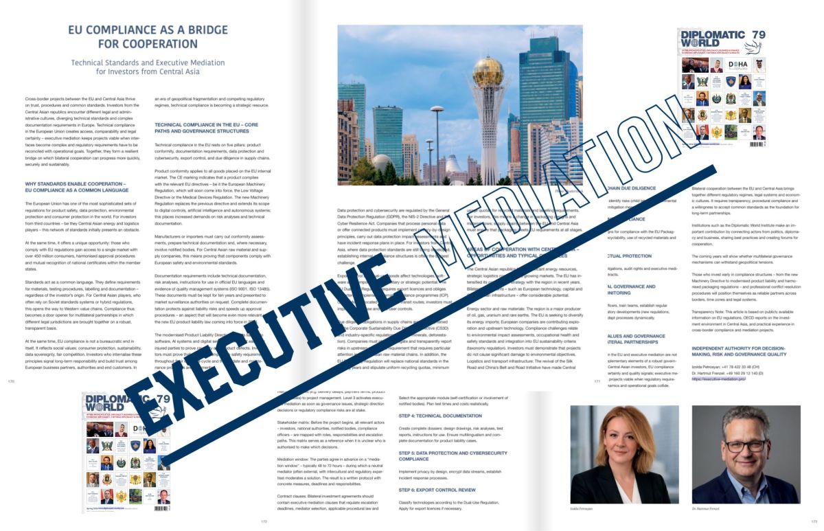 Im Beitrag\“Technical Standards and Executive Mediation for Investors from Central Asia\“in Ausgabe 79 des Diplomatic World Magazine erklären Izolda Petrosyan und Dr. Hartmut Frenzel, wie sich das ändern lässt. Ihr Ansatz: EU-Compliance früh und sichtbar einbauen – in Planung, technische Spezifikationen und Due Diligence. So wird aus einer Hürde ein Signal der Verlässlichkeit gegenüber Behörden, Banken und Vertragspartnern.