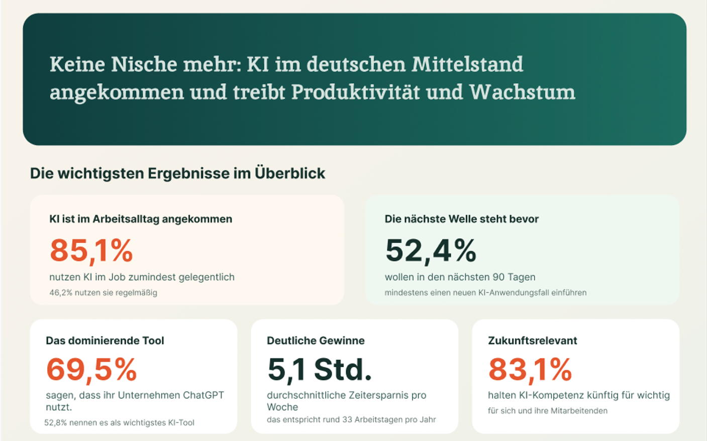 Die Studienergebnisse zeigen deutlich: KI ist im deutschen Mittelstand kein Zukunftsthema mehr, sondern gelebte Praxis– mit spürbaren Effizienz- und Produktivitätsgewinnen. Unternehmen, die jetzt investieren, Know-how aufbauen und klare Rahmenbedingungen schaffen, sichern sich entscheidende Wettbewerbsvorteile in einem zunehmend daten- und technologiegetriebenen Marktumfeld.
