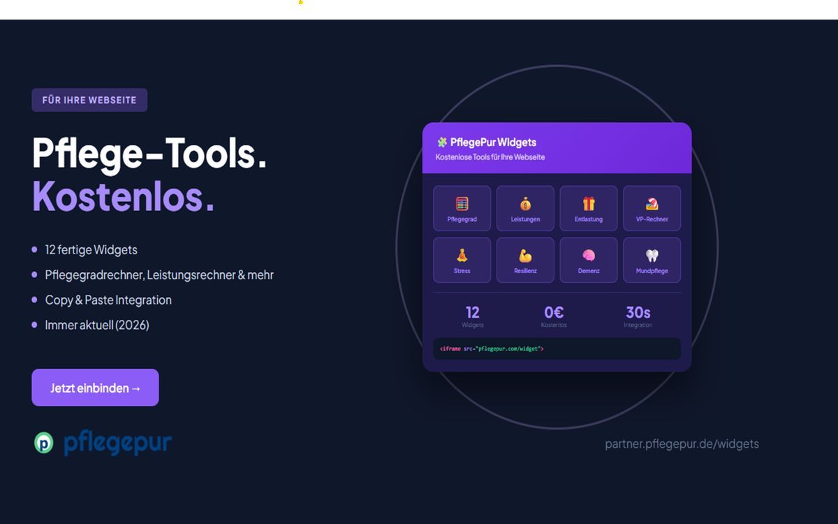 \“Wir sehen täglich, wie viele Pflegestützpunkte und Beratungsstellen noch mit veralteten PDF-Rechnern arbeiten\“, erklärt Melanie Zick, Gründerin von PflegePur.\“Mit unseren Widgets können sie ihren Besuchern sofort einen echten Mehrwert bieten – kostenlos und immer auf dem aktuellen Stand.\“
