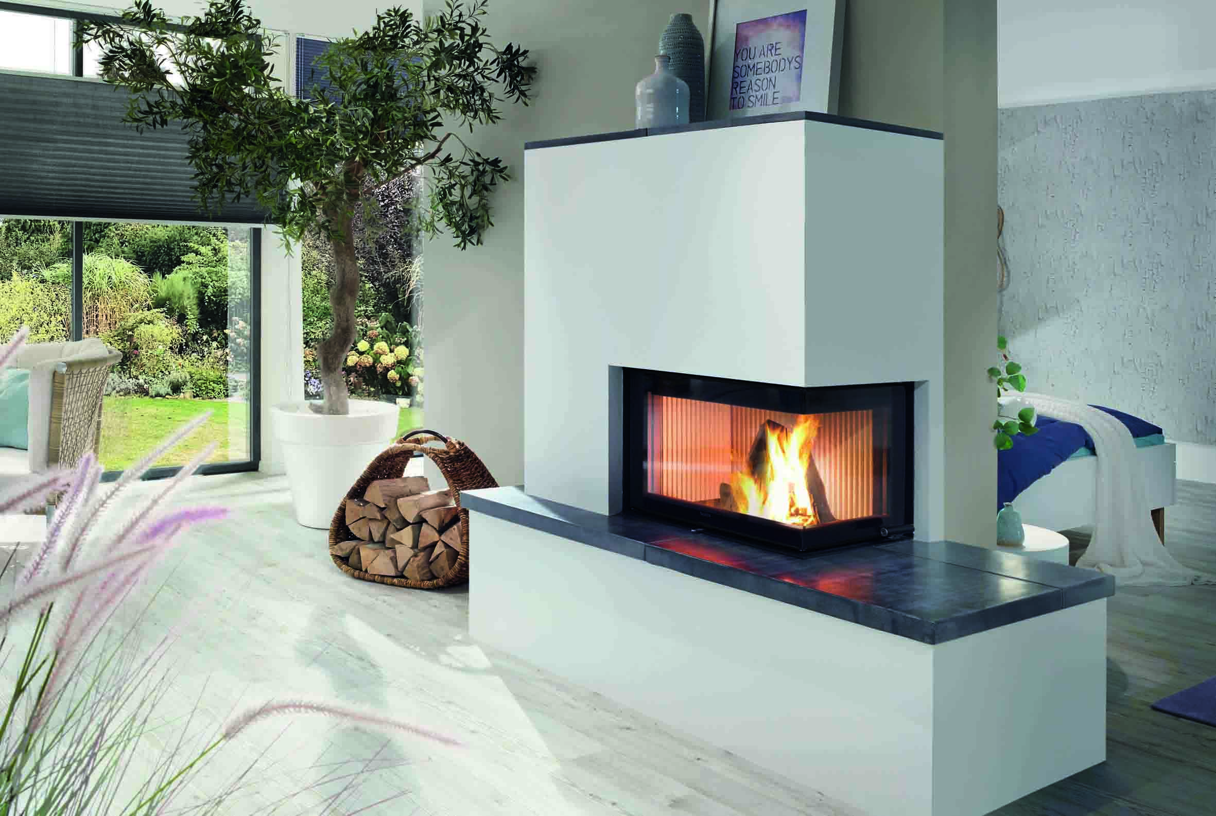 Ob als flache Variante, Durchsicht-Modell oder Eck-Ausführung – der Kamineinsatz lässt sich flexibel in unterschiedliche Raumkonzepte integrieren. Er trennt auf elegante Weise Wohn- und Schlafbereich oder schafft eine gemütliche Kaminecke. In Kombination mit einem Speicher erwärmt sich der Raum über die Sichtscheibe schnell, während überschüssige Energie zwischengespeichert und über Stunden gleichmäßig abgegeben wird.