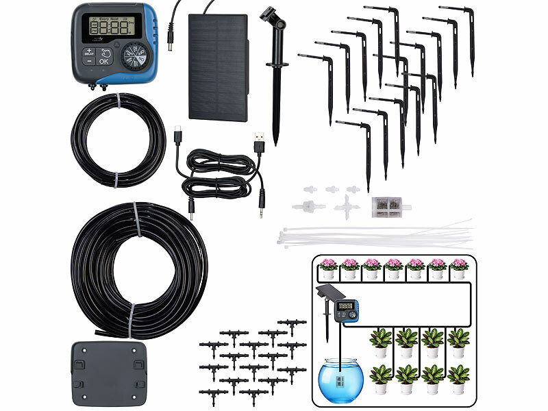 Schläuchen (je 1x 15 und 5 m), 15 Bewässerungstropfern, 15 T-Verbindern, 1 Kreuzverbinder, 3 Endkappen, 15 Kabelbindern, Filter, Anti-Rückfluss-Ventil, USB-Ladekabel (USB-C auf USB-A), kabelgebundenem Wasserstandmelder und deutscher Anleitung