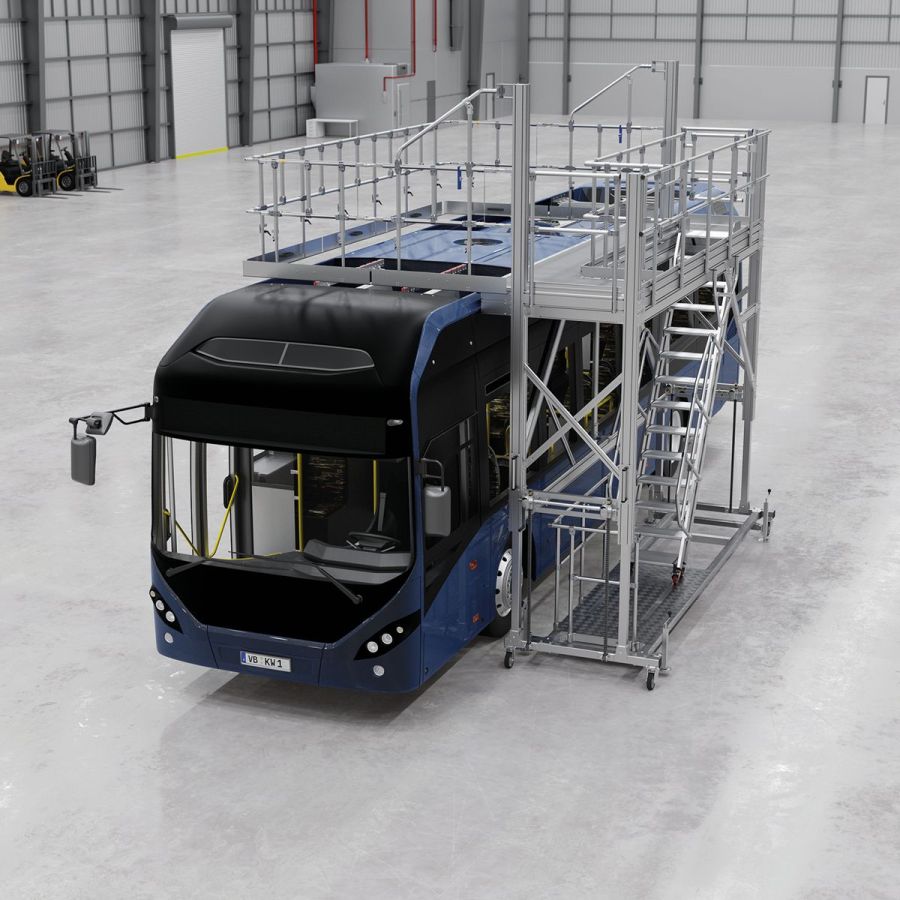 Eine höhenverstellbare und fahrbare Arbeitsplattform mit Geländerkorb schafft optimale Bedingungen. Mit einem Plattformhöhenbereich von 2.700 bis 3.700 Millimetern kann sie an unterschiedlichen Bustypen eingesetzt werden, ohne dass separate Systeme vorgehalten werden müssen.