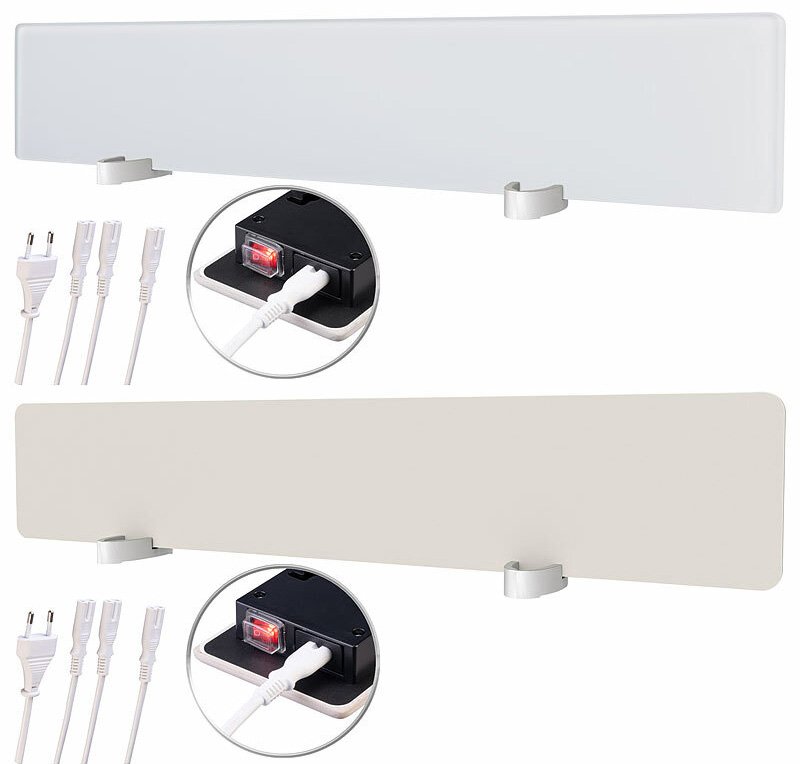 – Infrarot-Heizung inklusive Anschlusskabel, Verbindungskabel für weiteres Gerät, Standfüße, Montagematerial, Bohrschablone und deutscher Anleitung