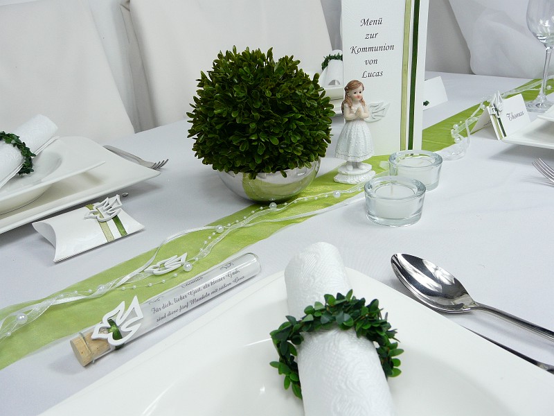 Auch individuell gestaltete Tischkarten spielen eine wichtige Rolle. Sie geben jedem Gast einen persönlichen Platz und unterstreichen zugleich die liebevolle Vorbereitung der Feier. Kleine Details wie passende Streudeko, Symbole wie Kreuz, Taube, Fisch oder Kelch sowie stilvolle Kerzenarrangements sorgen für eine feierliche Atmosphäre, ohne aufdringlich zu wirken.