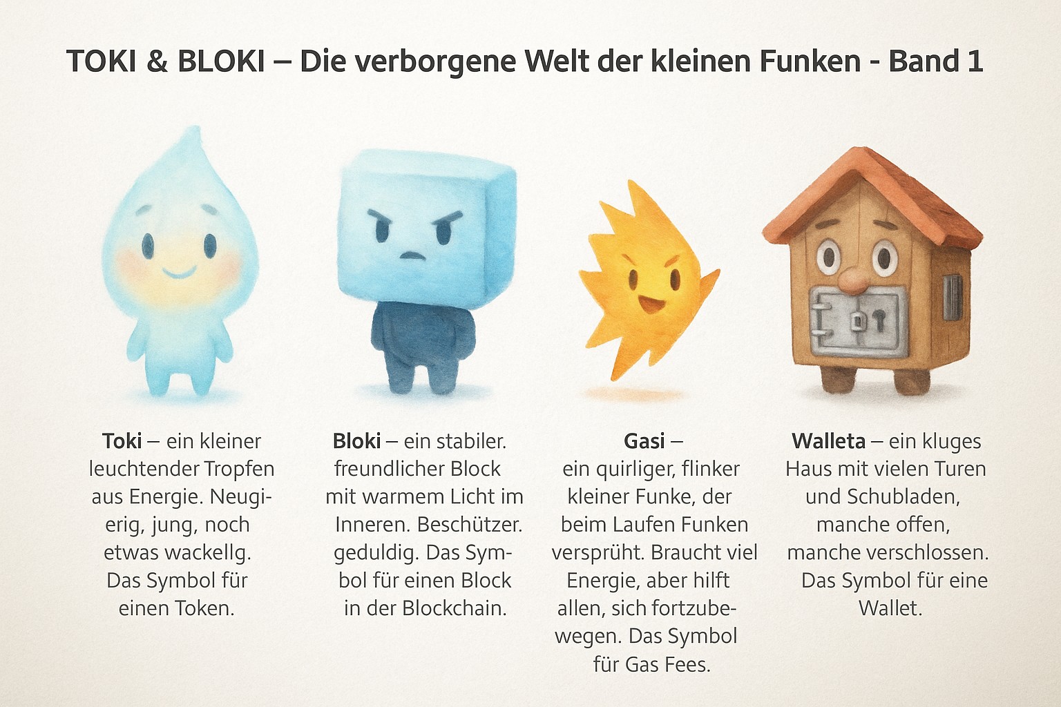 Im Mittelpunkt stehen die Figuren Toki, Bloki und ihre Freunde, die in einer Fantasiewelt – dem„Tal der Funken“ – leben. Jede Figur verkörpert eine Emotion oder einen Wert, etwa Freude, Sorge, Vertrauen oder Gemeinschaft. Durch Geschichten, ein Kartenspiel und begleitende Materialien lernen Kinder, Gefühle zu erkennen, zu benennen und einzuordnen.