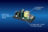 Das AC/DC-Netzteil bietet einen erweiterten universellen Eingangsbereich von 85–305VAC und ist für die Überspannungskategorie III (OVC III) bis zu einer Höhe von 3000m und in seinen gekapselten Varianten (OVC II) bis zu 5000m ausgelegt. Der Wirkungsgrad erreicht Spitzenwerte von über 90% und wird bis zu einer Last von 10% aufrechterhalten, während die Leistungsaufnahme im Leerlauf unter 100mW liegt. Verfügbar sind Versionen mit festen Ausgangsspannungen von 5V, 12V, 15V, 24V, 36V oder 52VDC, die alle über einen vollständigen Kurzschluss-, Überspannungs- und Überstromschutz verfügen.