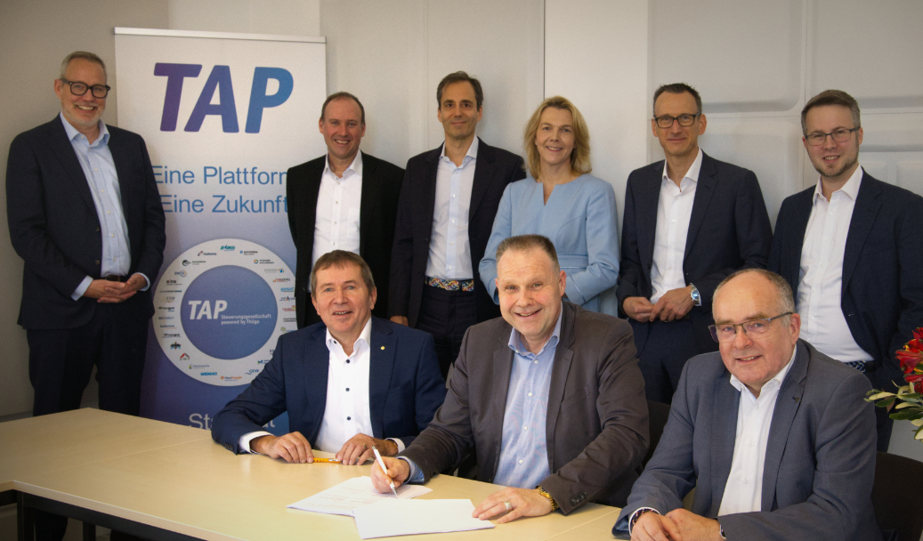 TAP-Gemeinschaft wächst. Gemeinsam bei der Vertragsunterzeichnung: vlnr Jan-Wilm Buschkamp, Geschäftsführer TAP SG, Willem Putters, Managing Director TechRES ASG portfolio lead Accenture GmbH, Robert Haber, Managing Director Utilities Accenture GmbH, Anne Rethmann, Vorständin Thüga Aktiengesellschaft,Holger Viehmann, Managing Director Head of Technology Industry Portfolio Delivery Austria, Switzerland, Germany Accenture GmbH, Patrick Frontzek, Geschäftsführer TAP SG, Paul Gehrig, Geschäftsführer SW Tauberfranken, Thomas Beier, Geschäftsführer SW Wertheim, Günther Peter, Geschäftsführer SW Freudenstadt. Leider konnte Udo Hirrle, Stadtkämmerer der SW Altensteig, nicht zum Fototermin anwesend sein.